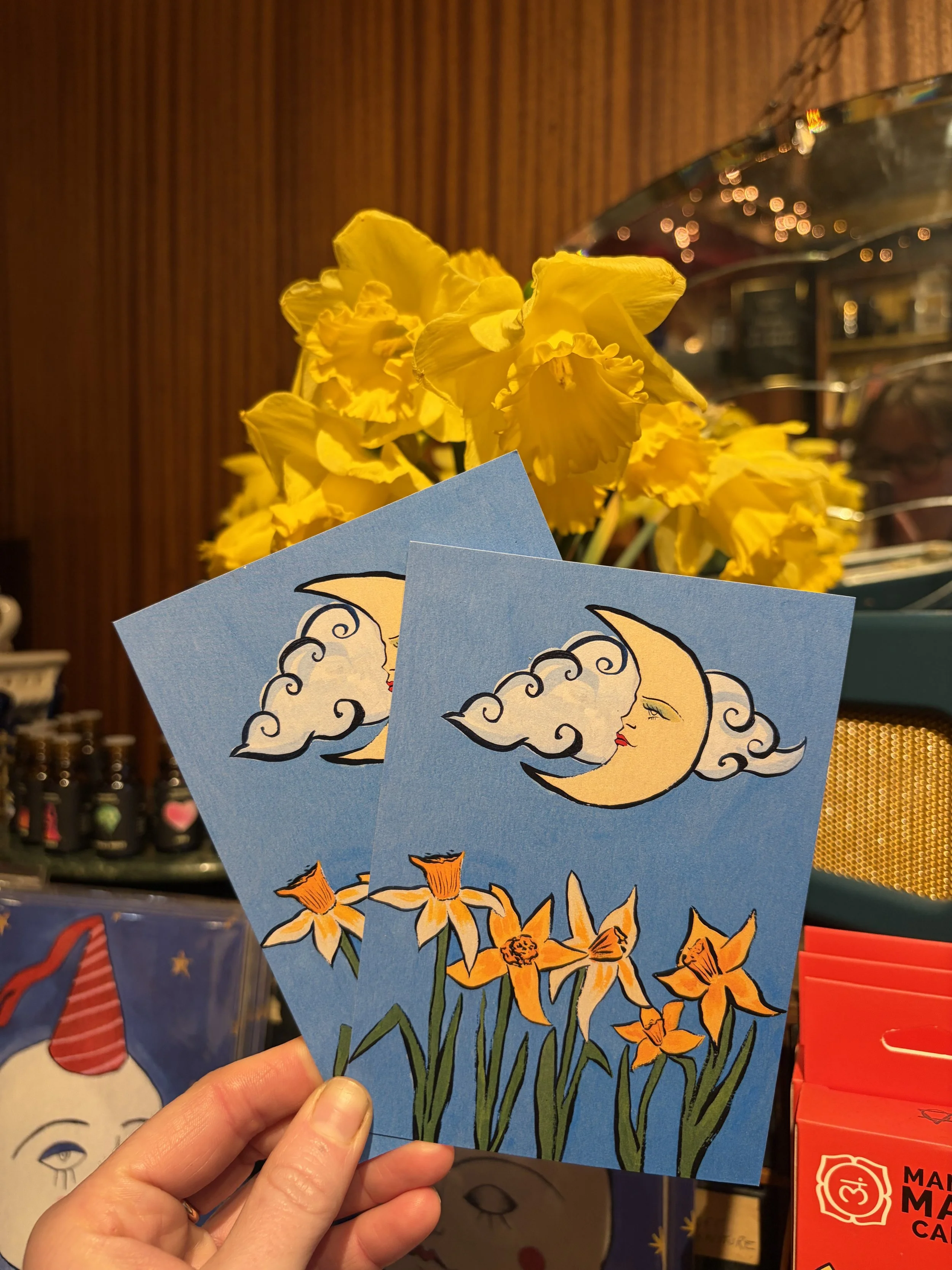 Each month, members of the Creepy Moon Postcard Club receive two art postcards straight from my studio. In the UK edition, you’ll also get a 2nd class stamp and a typewritten newsletter filled with moon phase magic, creativity prompts, and behind-the-scenes stories — so you can keep one postcard for yourself and send the other to a friend or loved one.
