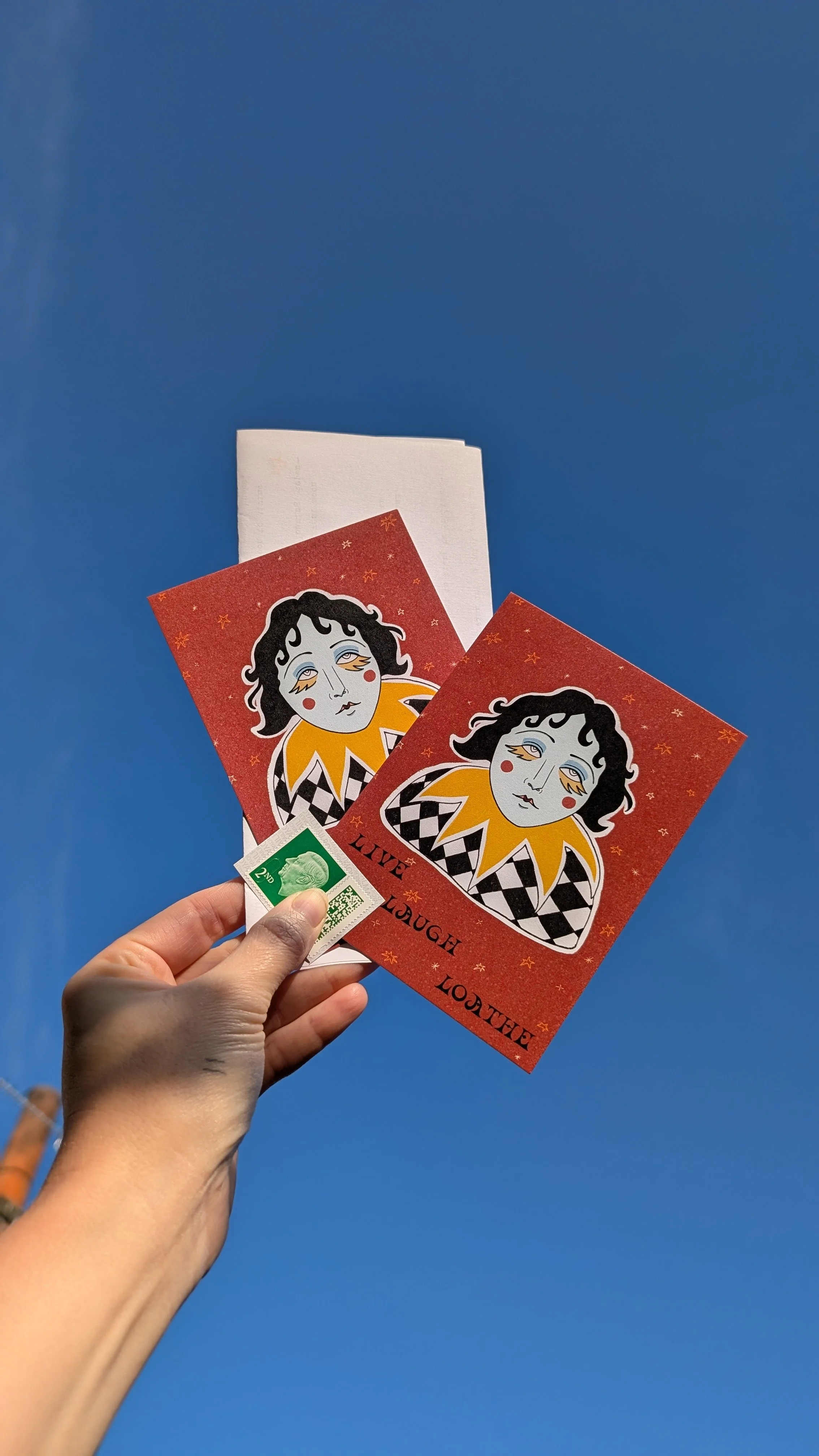 Each month, members of the Creepy Moon Postcard Club receive two art postcards straight from my studio. In the UK edition, you’ll also get a 2nd class stamp and a typewritten newsletter filled with moon phase magic, creativity prompts, and behind-the-scenes stories — so you can keep one postcard for yourself and send the other to a friend or loved one. For our European friends, the club works the same (minus the stamp), so you can still enjoy a touch of whimsical art and lunar inspiration landing in your letterbox every month.